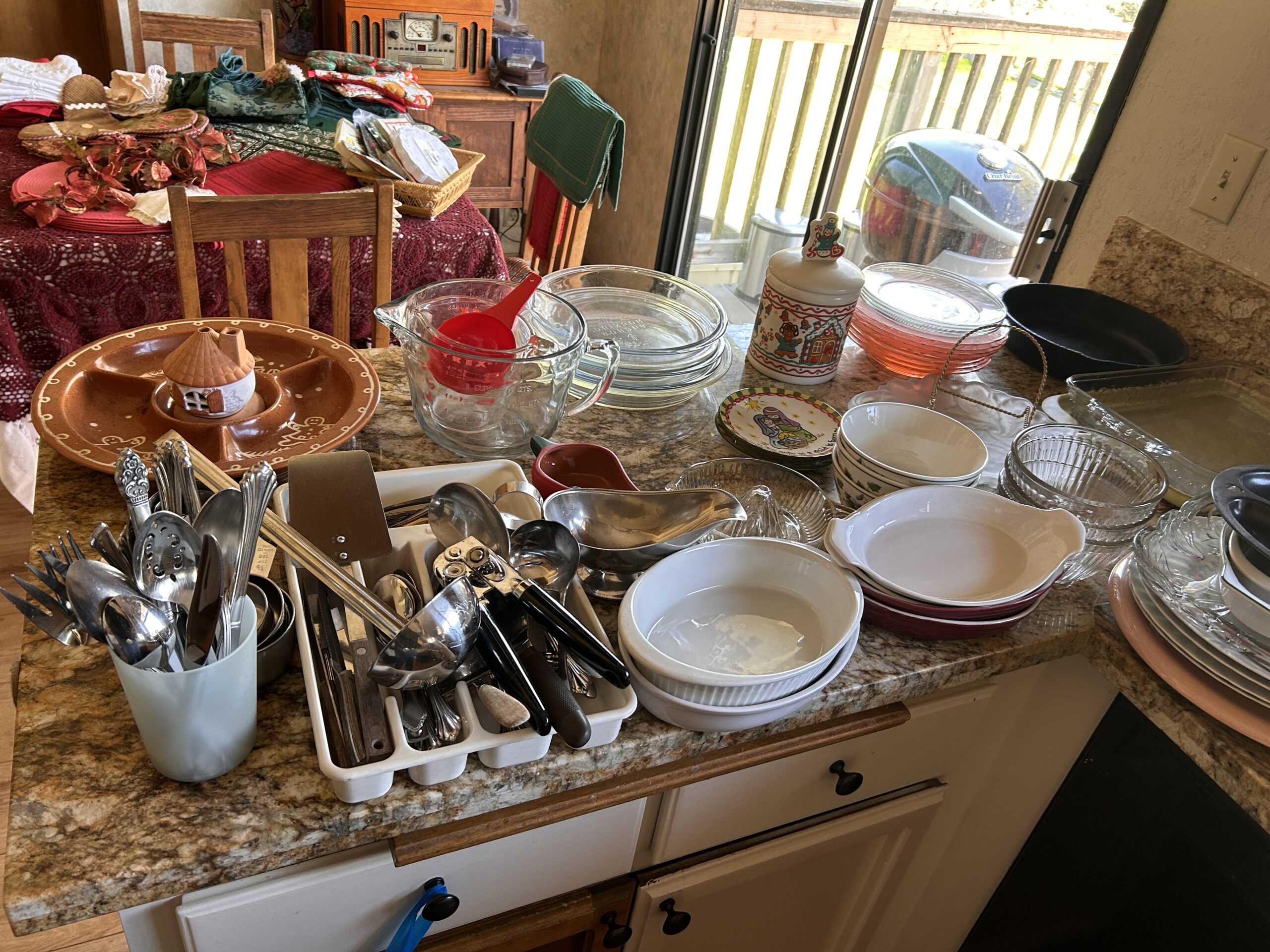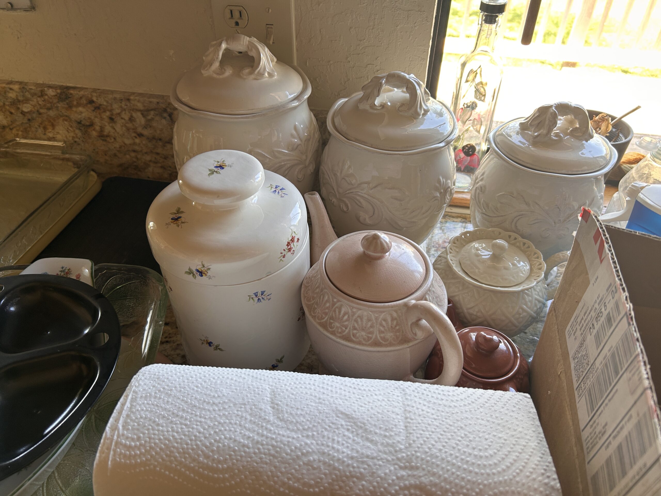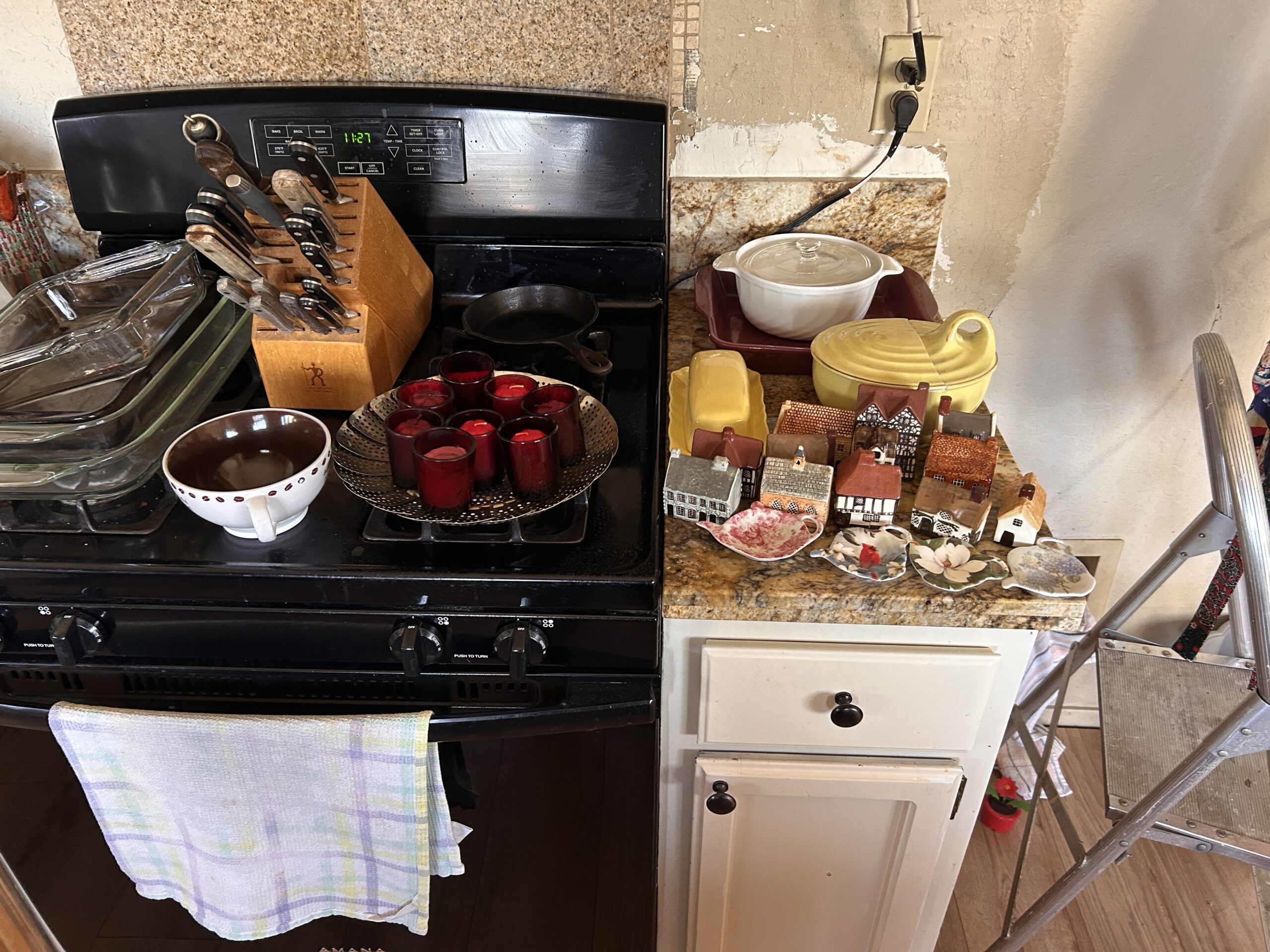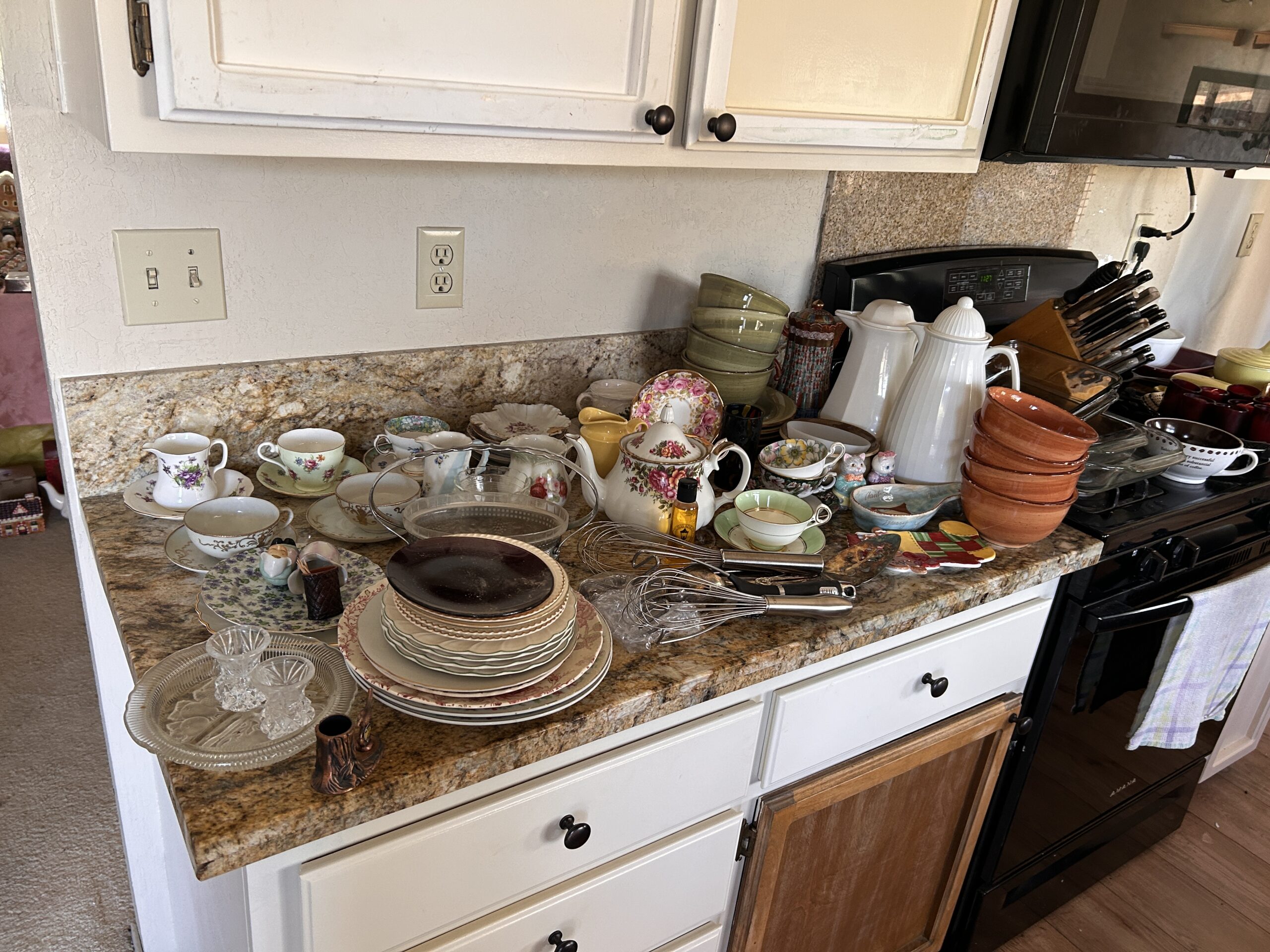 Includes vintage floral aprons, embroidered towels, oven mitts, and a tin canister. Cozy cottagecore feel with useful function.